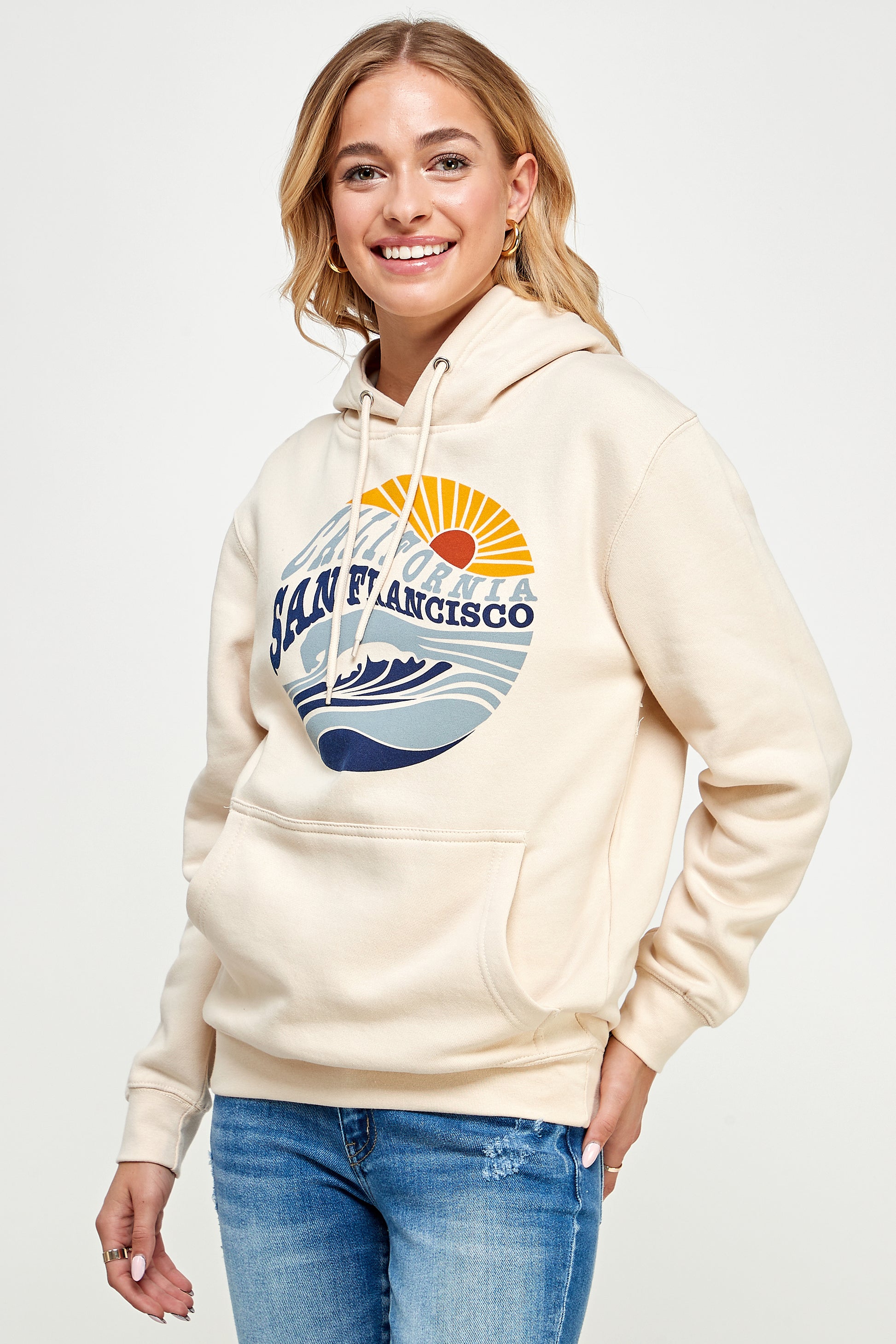 Elevate your coastal style with our Maverick Hoodie in the serene sandshell color. This hoodie features a charming print of the sun and ocean, capturing the essence of relaxation and beach vibes.